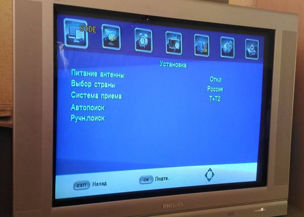 Всё удачно подсоединили и переходим к настройкам списка каналов. Начните с поворотов антенна, она должна быть направлена на телевышку. Если развернули ее правильно, то телевизионные каналы будут транслироваться без помех.