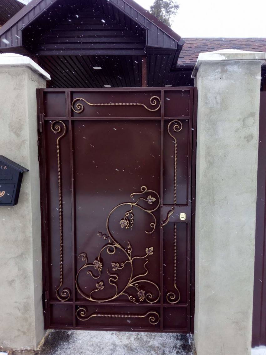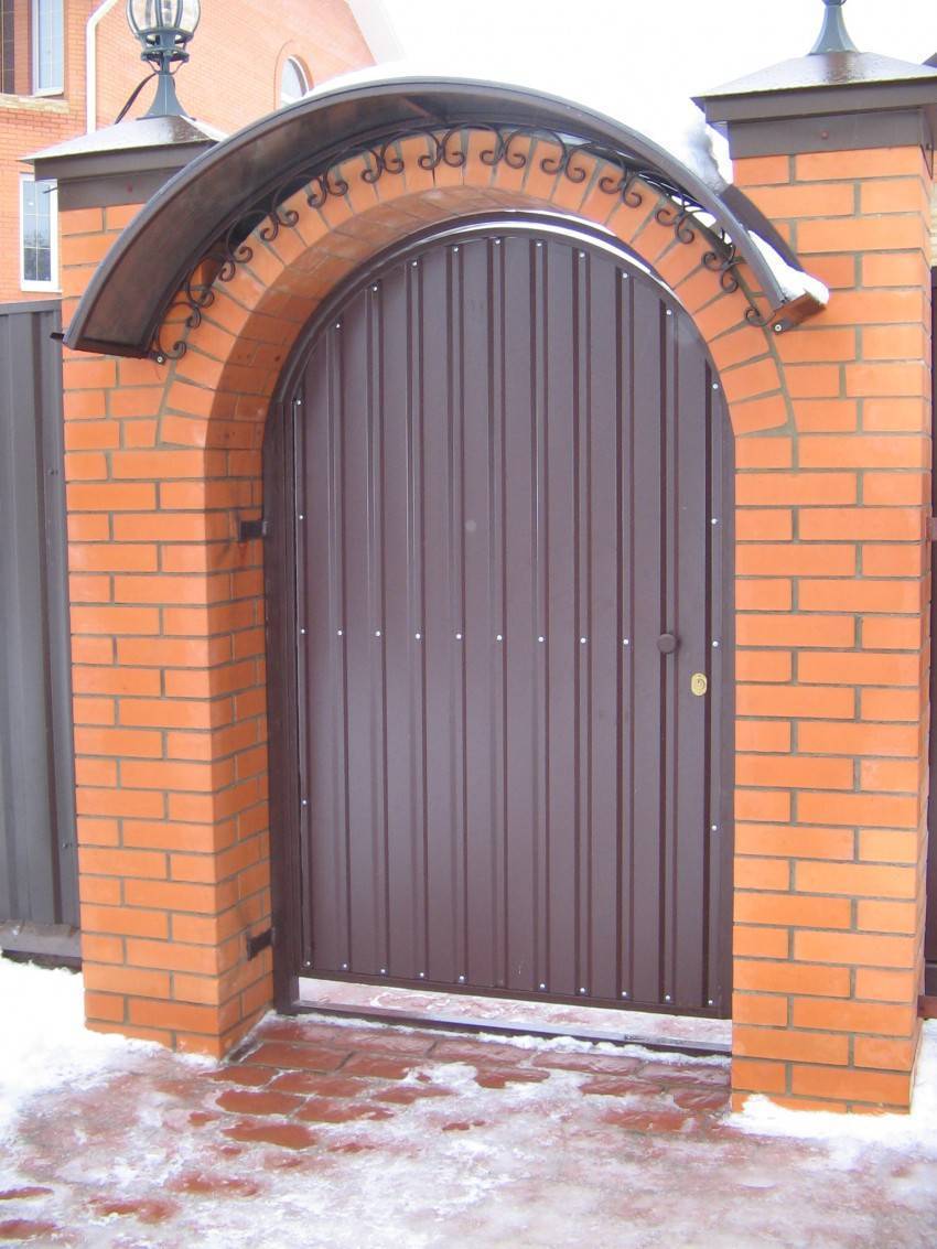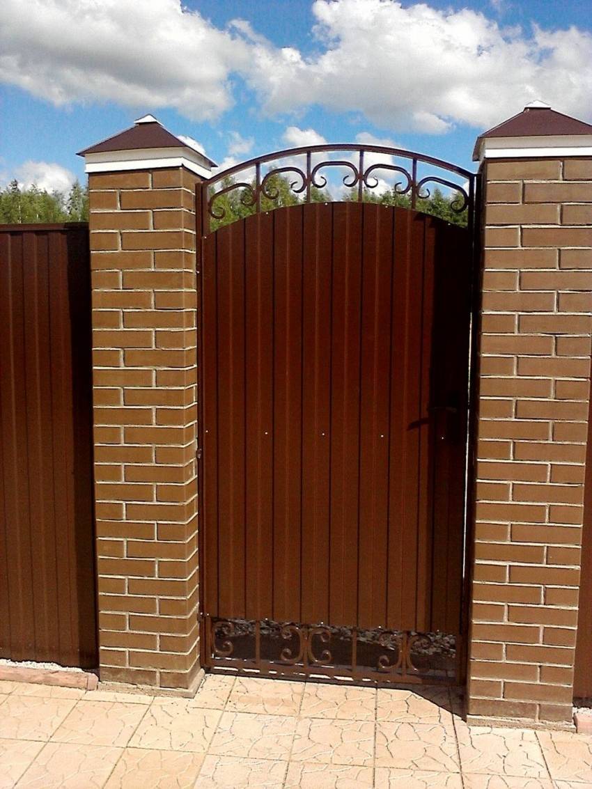 Поскольку профлист является сплошным, конструкцию из него можно сделать только глухую. По форме калитки из профнастила могут быть прямоугольными или в виде арок. Следует учитывать, что арочный вариант более сложен в изготовлении. Обычно калитка выполняется как отдельная конструкция, но если в ограждении есть ворота, то ее нередко встраивают в них.