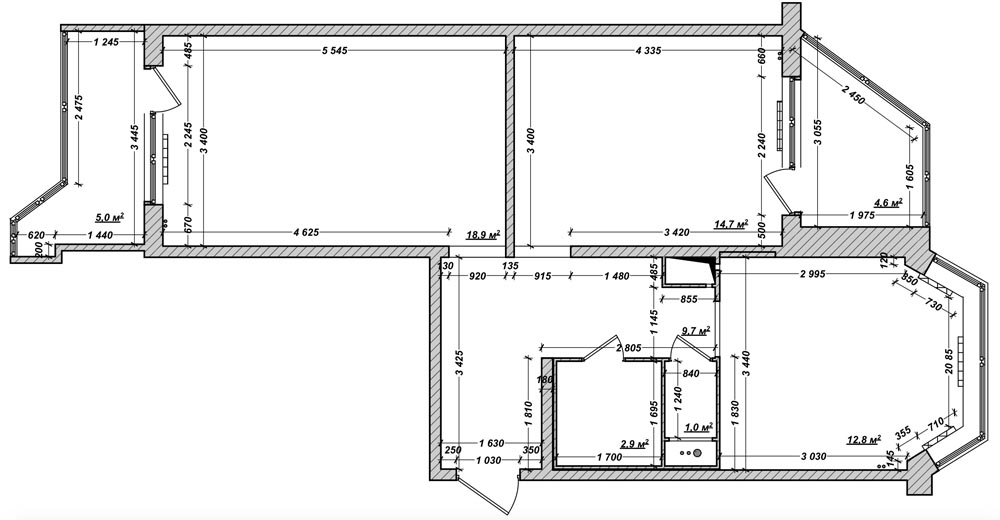 Такой вариант встречается редко. Чтобы выполнить расчет, комнату следует разделить на несколько прямоугольников. Квадратуру тех, что добавляют площадь, следует прибавлять, а те, что уменьшают – отнимать.