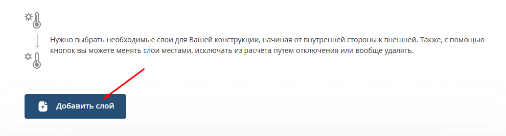 - Указать слои конструкции – кирпич, пеноблок, наружная и внутренняя штукатурка, утеплитель и т.д. Калькулятор предлагает удобную опцию –возможность менять, добавлять или удалять слой, а также проводить расчеты по каждому из вариантов.
