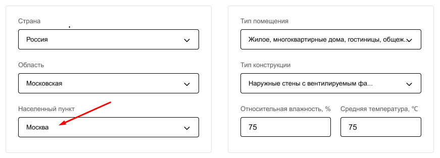 - Географическое расположение квартиры, дома или перспективного строительного проекта – это необходимо для определения климатической зоны и связанных с ней характеристик (температурный режим, влажность и т.д.). Вам нужно выбрать Ваш город из огромного списка стран СНГ.