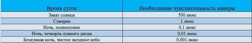 От чувствительности, измеряемой в люксах, зависит уровень освещённости, при котором возможна трансляция картинки, позволяющей хорошо различать детали. При ясной погоде в полнолуние от камеры, имеющей чувствительность в одну десятую люкса, будет поступать изображение хорошего качества.