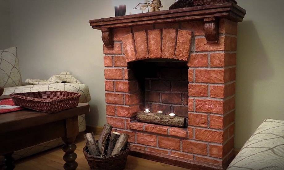 При наличии навыков строительства камин делают из декоративного кирпича. Данный материал обеспечивает максимальное сходство с настоящим очагом. Однако в городской квартире он должен быть компактным, чтобы не занимать слишком много места. Также нужно точно знать, сможет ли перекрытие осилить нагрузку от готовой конструкции, особенно если камин предполагается сделать крупногабаритным. Иногда просто выкладывают рамку для камина – так называемый каминный портал.