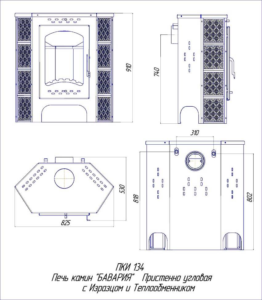1. Печь-камин «Бавария» выполнена из 6-миллиметровой стали, изнутри футерована шамотным кирпичом. Мощность печи – 6 кВт, что позволяет обогреть домик площадью до 60 квадратных метров. Режим длительного горения у этой печи составляет 3-5 часов, печка оснащена огнеупорным стеклом, которое, благодаря системе чистого горения, не подвержено копоти, а также термоизолированной ручкой дверцы, что позволит вам не обжечься. Боковые стенки печи облицованы керамикой, это придает ей привлекательный внешний вид.
