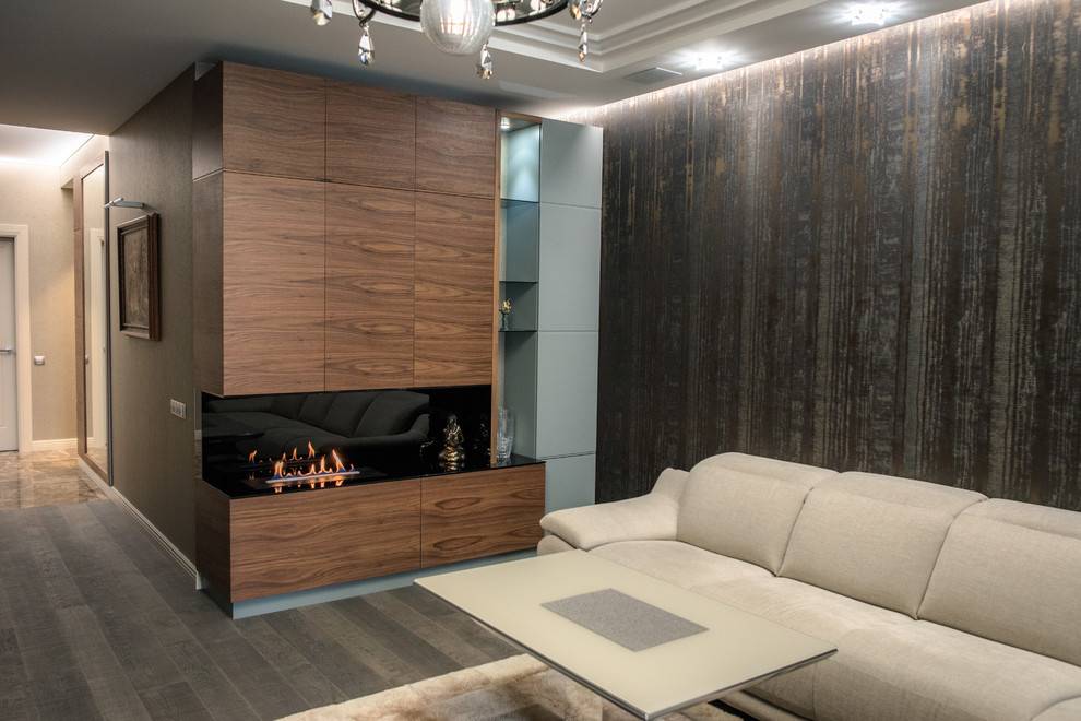 Постройка подлинного камина, включая дымоход, в квартире только с целью отопления, к сожалению, невозможна, поэтому в наши дни особой популярностью пользуются фальш-камины (просто как декорация к залу) или электрокамины, которые способны нагревать помещение и заменить батареи, производить настоящий огонь, но без дыма с помощью использования экологически чистого топлива. В таком случае, материалами для обустройства каминной зоны будут дерево, гипсокартон или плитка.