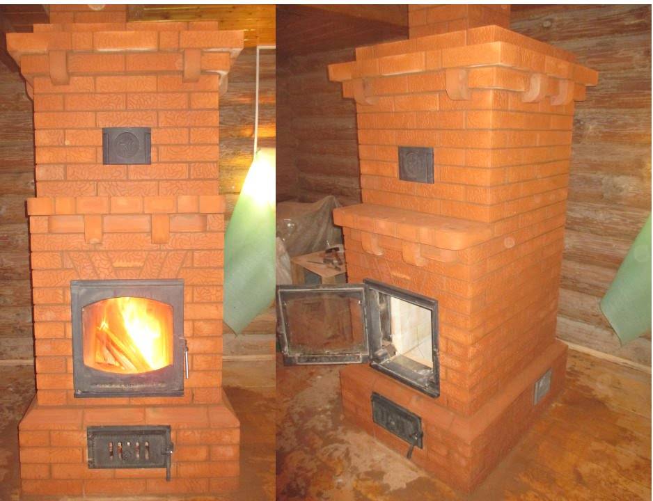 В такую конструкцию свободно монтируется каминная дверца (400х400 мм). Она придает солидный внешний вид. Причем кроме декоративных функций, благодаря такой дверке, лучевая энергия очень быстро прогревает комнату.
