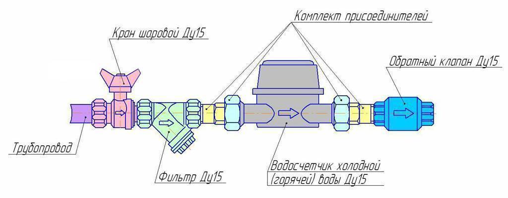 Отборно-учетный узел состоит из запорного вентиля, фильтра грубой очистки, счетчика воды и обратного клапана. Собирается, как показано на рисунке. На каждом из приборов указывается направление тока воды для него, его обязательно нужно соблюдать при сборке.
