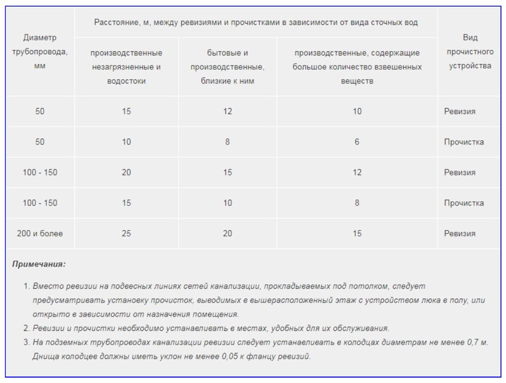 На горизонтальных участках элементы устраивают на расстоянии 8 или 10 м, а также на поворотах и разветвлениях. Ревизии с диаметром 50 мм устанавливаются на чистых производственных стоках каждые 15 м, на бытовых трубопроводах – через 12 м, на загрязнённых промышленных водах – с отрезками в 10 м. Для элементов с диаметром 110 мм при тех же условиях принимаются расстояния: 15, 20 и 12 м.
