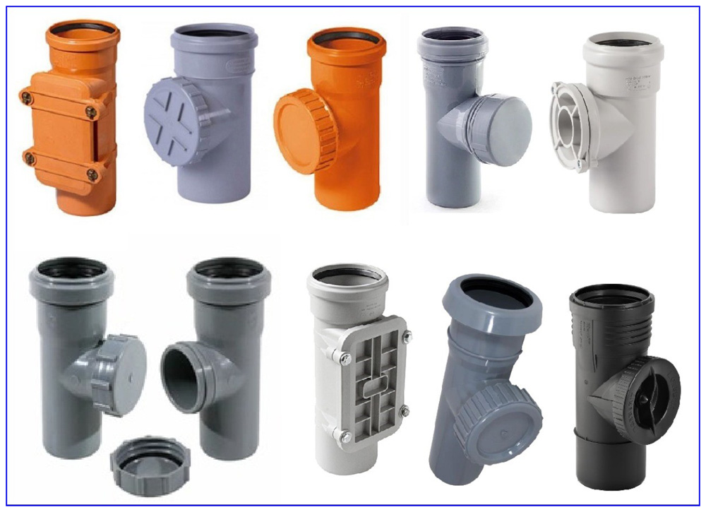 Выпускаются ревизии с диаметром 50 мм при длине 115 мм, используются в монтаже канализационных стоков раковин, ванн и душевых. Для санузлов применяются тройники с размером сечения 110 мм с длиной 185 мм.