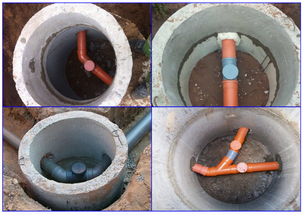 При монтаже канализации с обеих сторон колец пробивают при помощи перфоратора сквозные отверстия в 110 мм, просовывают в них трубы и монтируют изнутри ревизию.