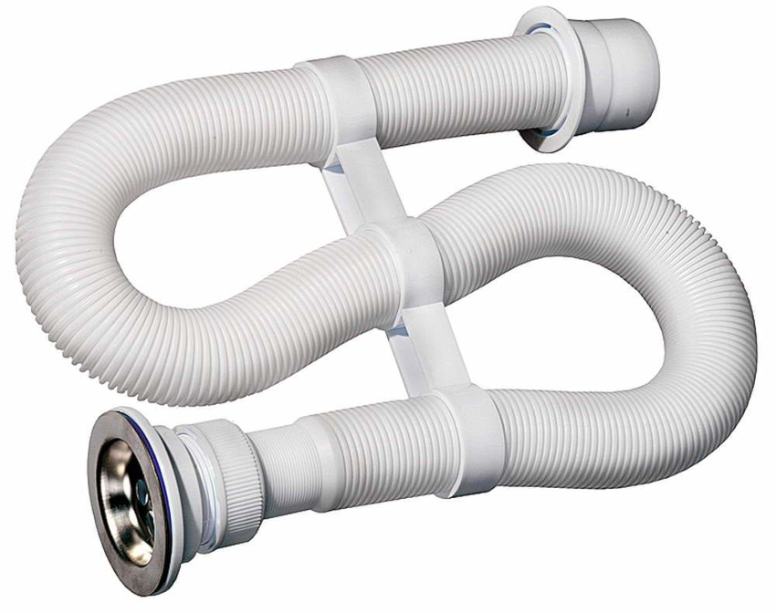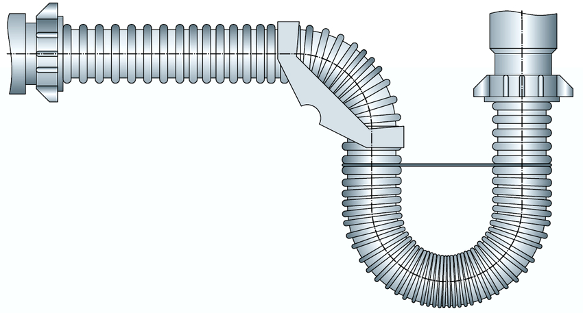 Гофрированный тип сифона представлен полипропиленовой модификацией, которая отличается прочностью, гибкостью и возможностью монтажа при обустройстве систем канализации в малогабаритных помещениях. Благодаря своей пластичности такая труба может располагаться в тех местах, где нельзя разместить другие типы сифона. Это самый простой вариант, в составе которого присутствует минимальное количество элементов, не нуждающихся в сборке.