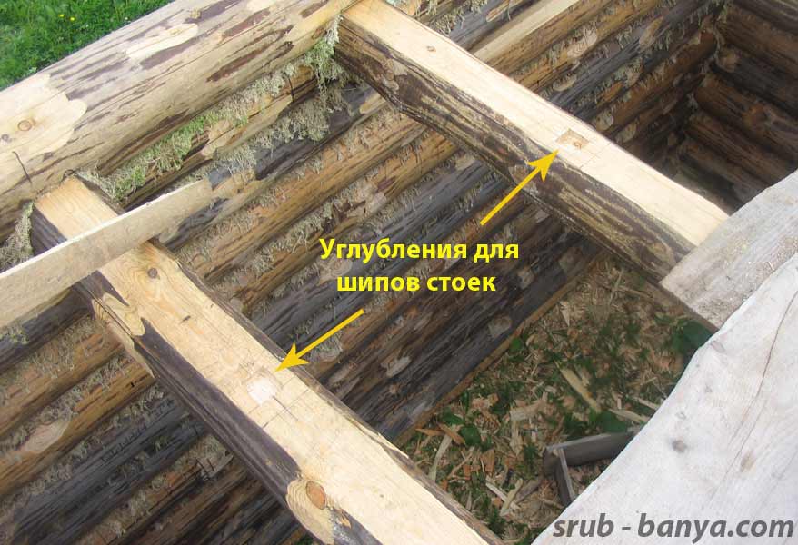 Углубления для шипов стоек. После установки ферм, монтируем стойки. На одинаковом расстоянии от мест опоры стропильных ног при помощи шнура размечаем места установки шипов стоек и при помощи стамески и молотка (киянки) делаем углубления. |