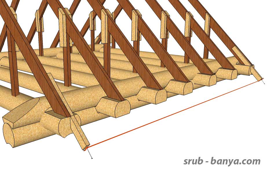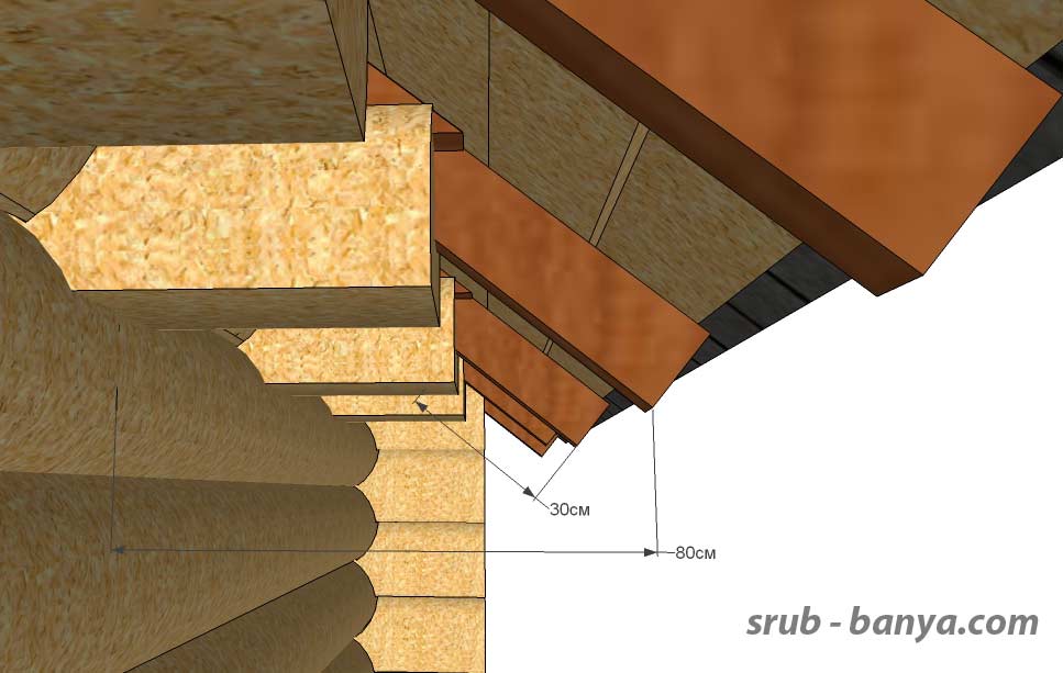 Свес крыши. Следующий этап монтажа стропильной системы — монтаж кобылок. Кобылка — отрезок доски, удлиняющий стропильную ногу для организации свеса крыши. Кобылки изготавливаем из доски сечением 5см на 10см. Длина кобылки — 1 метр. Выпуск кобылки за стропильную ногу в нашей конструкции составляет 30см, что позволяет организовать свес крыши (расстояние от конца кобылки до стены) 80 см. Рекомендую это расстояние делать не менее 75см. Это позволит надёжно защитить стены от атмосферных осадков и, при необходимости, разместить под навесом штабель дров для печки. Если стропильная система другой конструкции, то значение выпуска кобылки будет другим. Наша задача — сделать такой выпуск, который организует требуемый свес крыши. Для деревянного строения свес крыши должен составлять не менее 60см, для кирпичного — не менее 45см. |