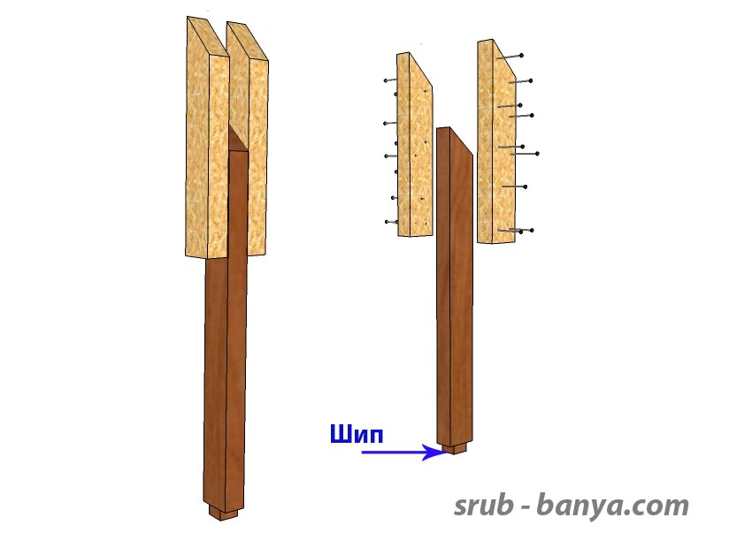 Сборка стойки. Прибиваем к стойке заранее заготовленные накладки. Для сборки применяем гвозди 100мм — «сотки». |