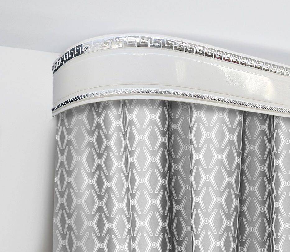 Ещё одна разновидность карнизов предназначена для оформления проёмов сложной конфигурации – гибкие пластичные ленты. Их изготавливают из алюминия с полимерным напылением или из ПВХ. На поверхности расположены бегунки-крючки и заглушки, а также производители выпускают конструкции с системой кордового управления.