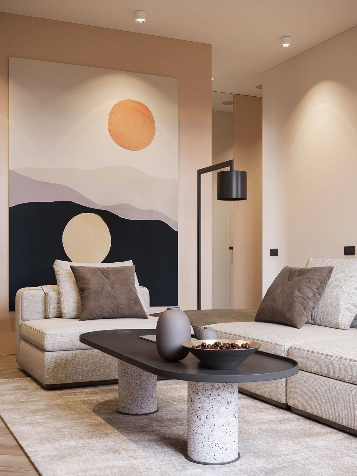 С помощью абстрактной картины можно создать особую атмосферу в гостиной