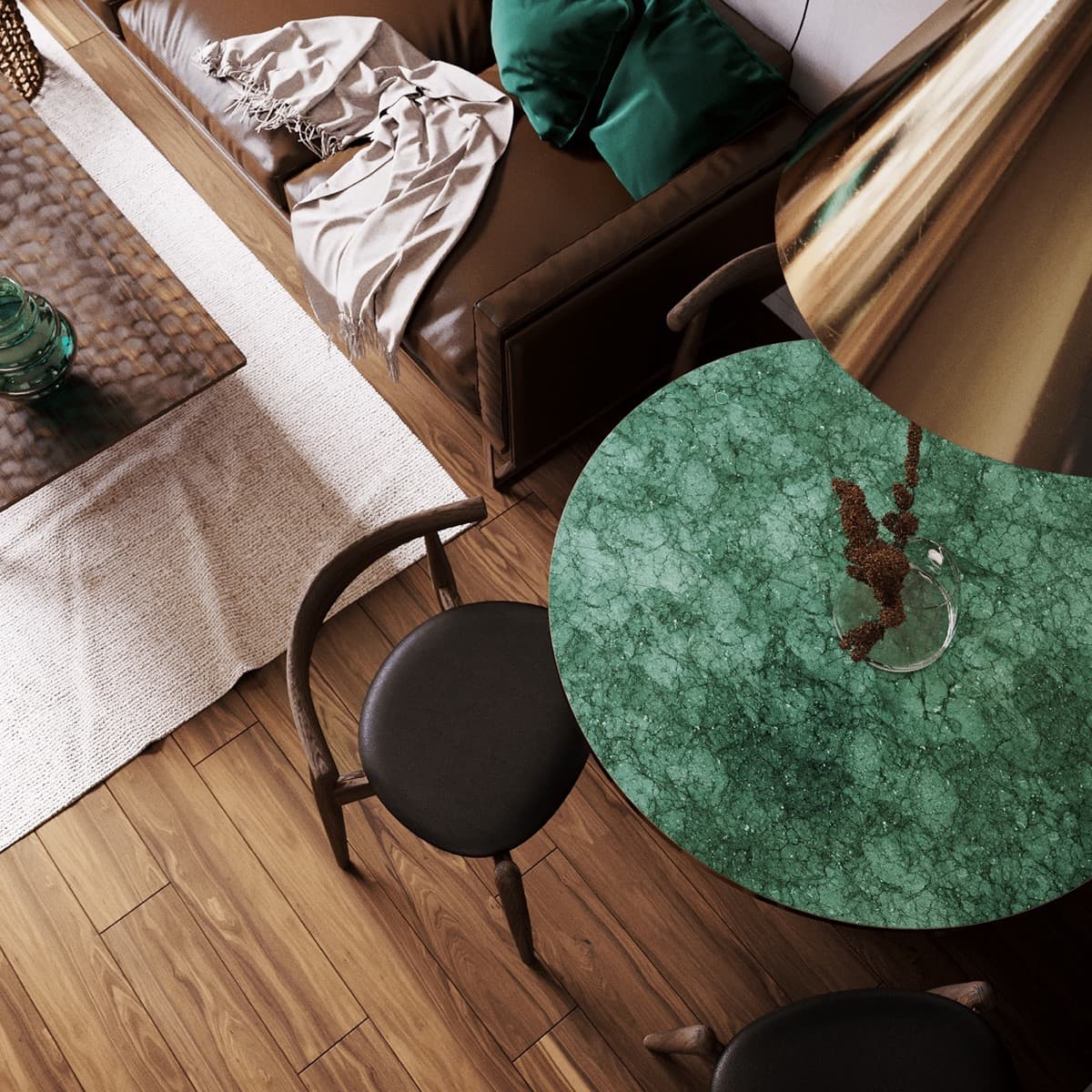 Изумрудный цвет в интерьере идеально сочетается со всеми оттенками коричневого