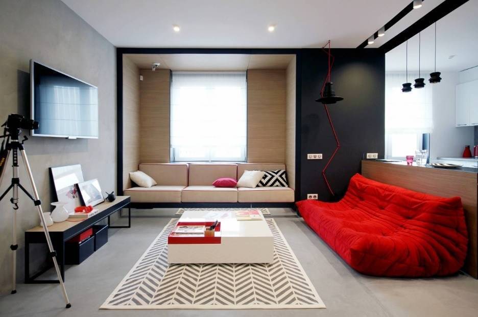 Такое решение всегда выглядит смело и привлекает внимание. Нередко для интерьера в стиле хай-тек или этно используется яркий акцент в виде красного дивана