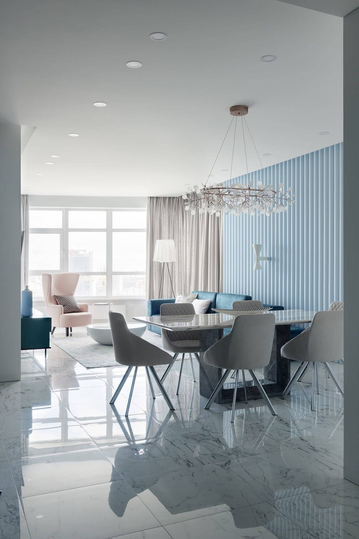 Глянцевый пол напитывает и отражает всю свободу и свежесть голубых стен
