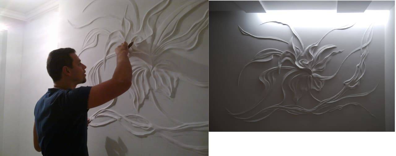 - Ещё один оригинальный способ украсить стену – когда шпаклёвка наносится ровным слоем на всю поверхность, а затем по линиям рисунка прорезаются углубления.
