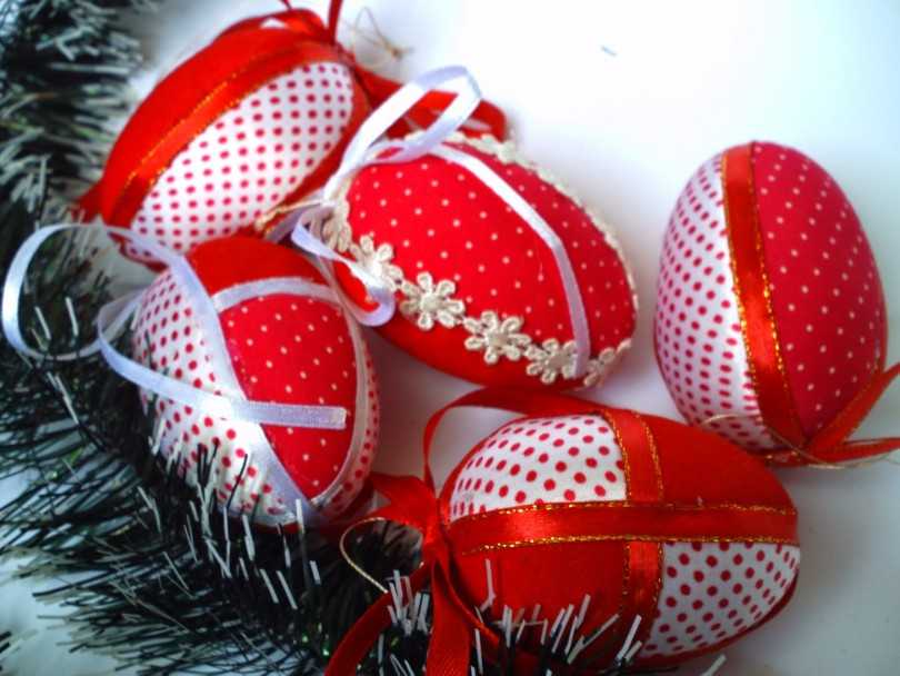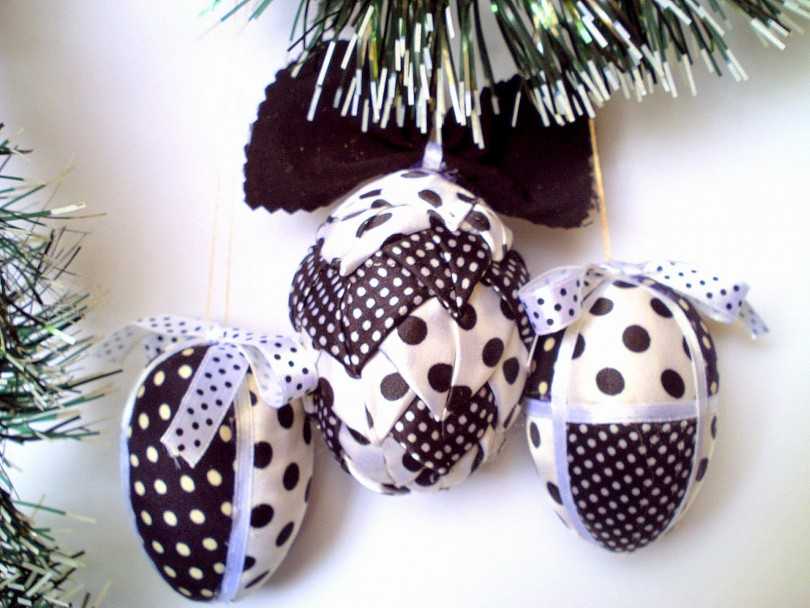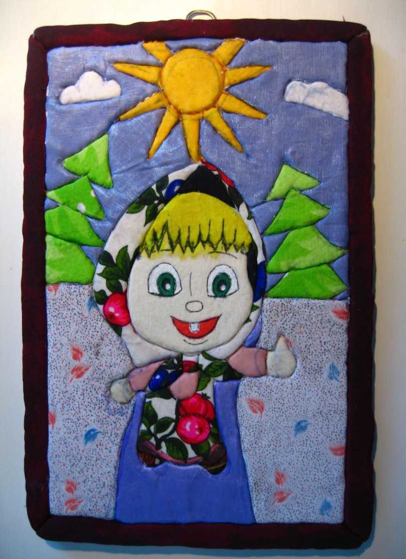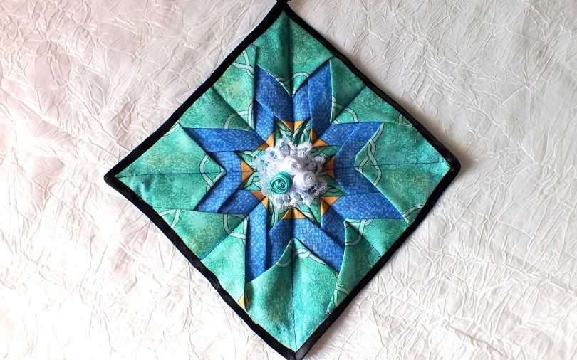 Из флизелина вырезать круг и приутюжить к заготовке треугольников, прошить. К краям пристрочите тесьму для декора и сделайте небольшую петельку. Полученный материал соедините с заготовленным кругом из однотонной ткани. Готовое изделие прогладьте.