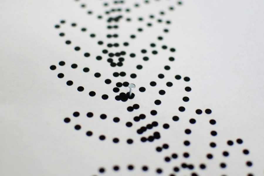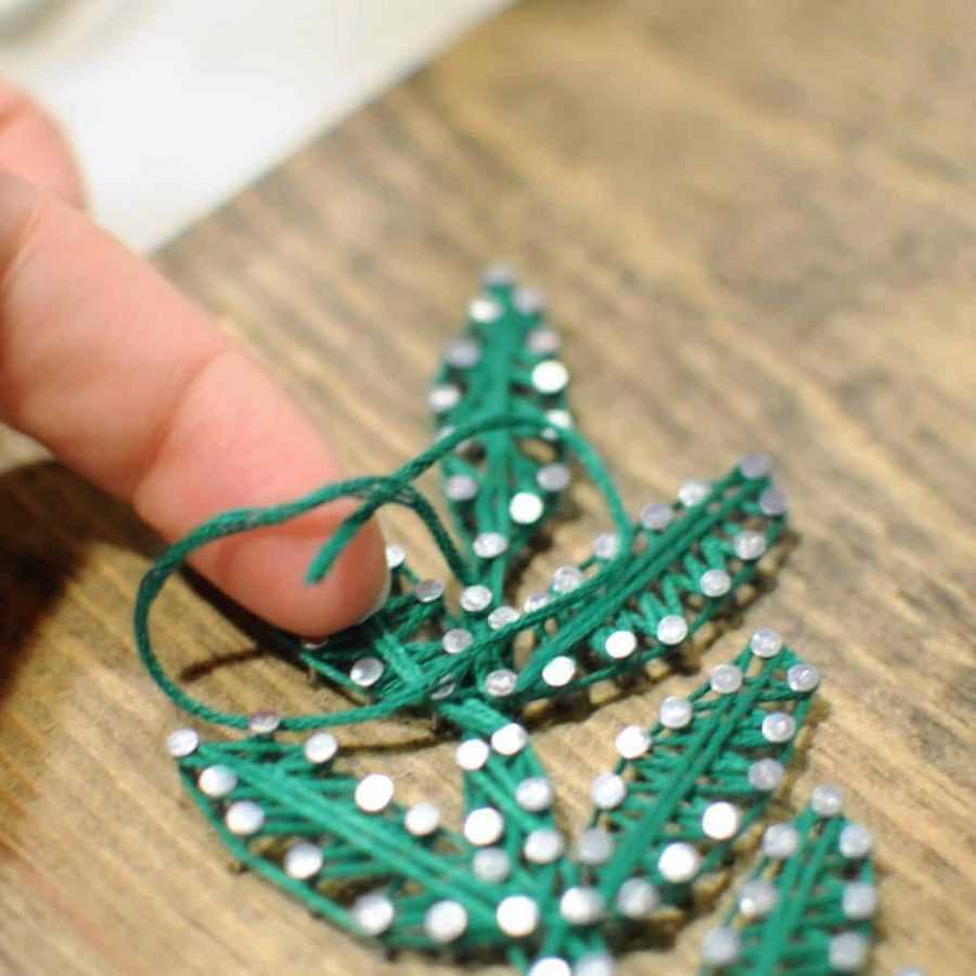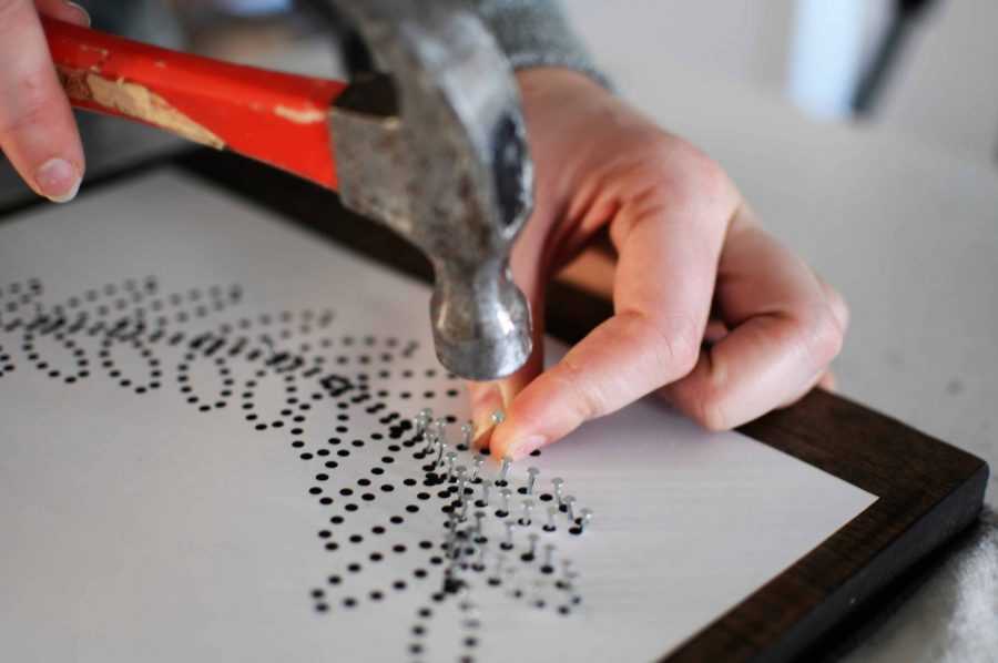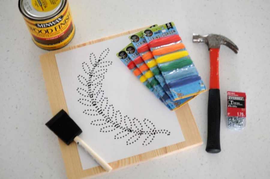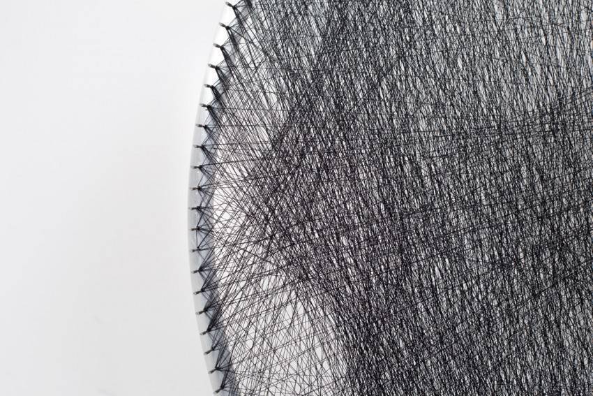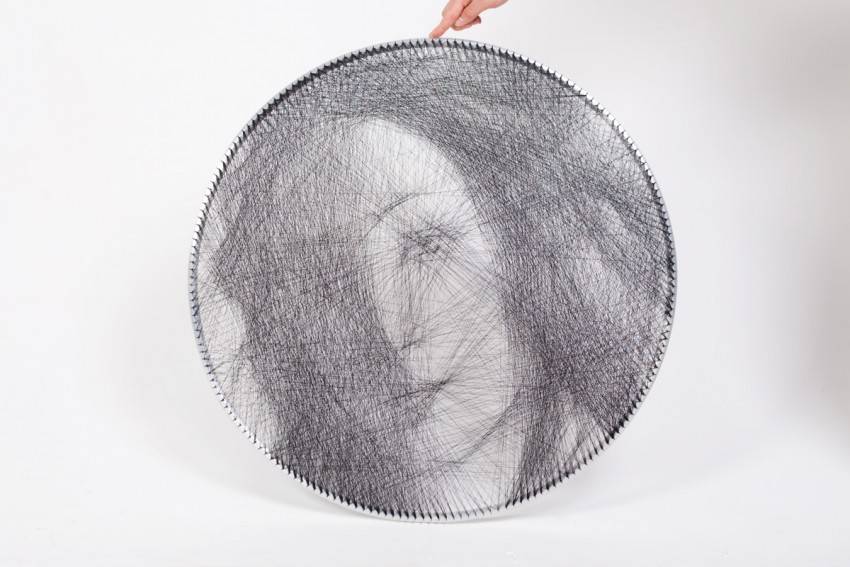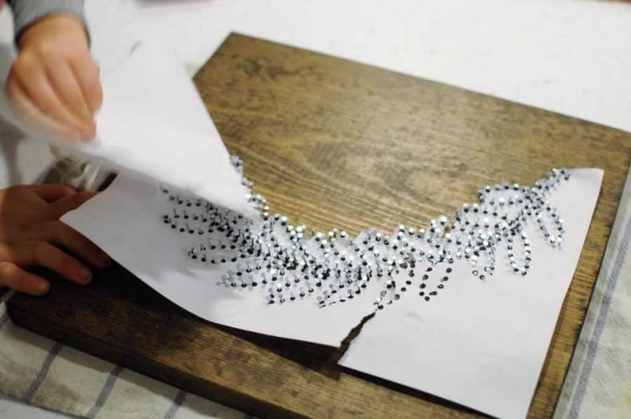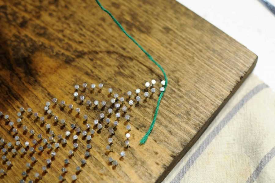 По контуру шаблона забиваются мелкие гвоздики, немного не до конца, чтобы можно было легко цеплять за них нитки. Убрав шаблон, можно получить контурное изображение из натянутых, переплетенных нитей.