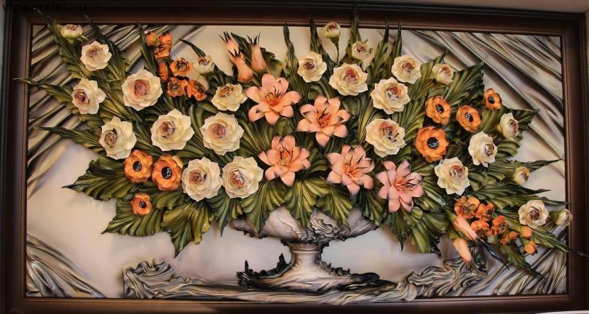 Из кожи тоже делают панно, используя ее вместо ткани. Этот вариант более дорогой, поскольку натуральная кожа не самый дешевый материал. Сама по себе кожа — отличный вид материала для рукоделия. Она прочная, качественная, пластичная. Кожаную ткань можно взять от старых сумок и вещей, которые либо не в моде, либо постарели. Это отличный способ сделать так, чтобы они принесли хоть какую-то пользу. Для изготовления панно из кожи понадобятся все те же материалы, что и для тканевого.