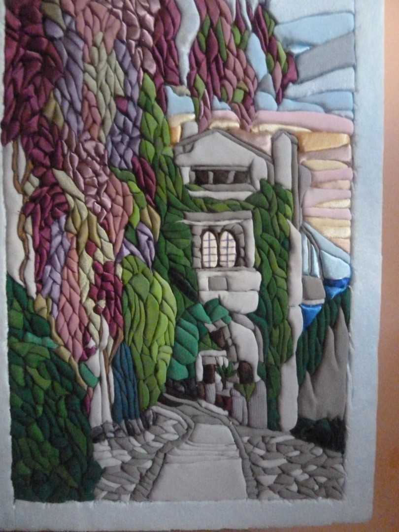 Японскую технику кинусайга можно обозначить как пэчворк без иглы. Картины из лоскутков ткани своими руками создаются на деревянной доске или пенопласте. Эскиз прорезается на основе, а потом «набивается» текстилем. Он может быть гофрированным, натянутым или «в складочки».