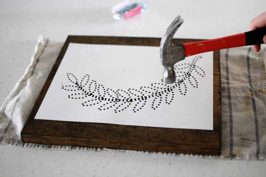 Потребуется тонированная основа, желательно из толстой фанеры или ДСП. На нее несколькими капельками клея надо приклеить шаблон из картона или плотной бумаги. Это могут быть рисунки красивых листьев, цветов, фигурки животных или абстракция.