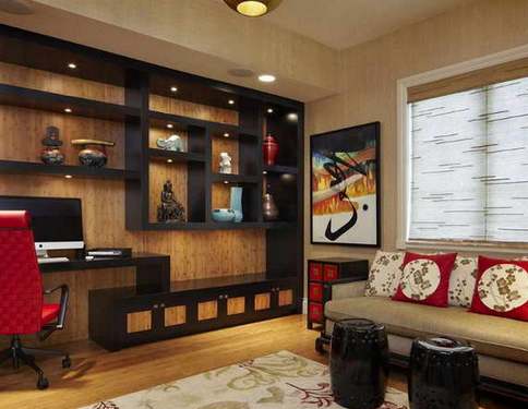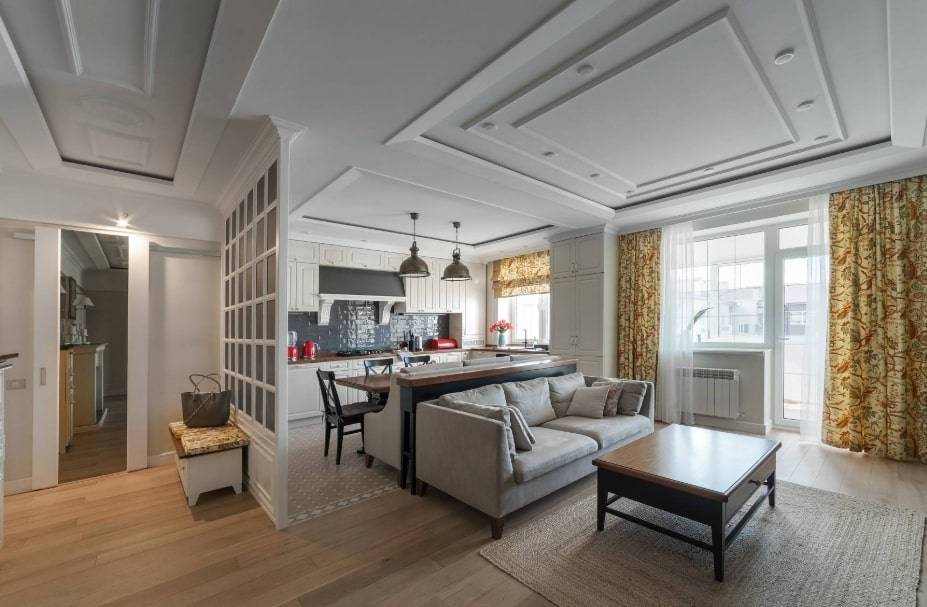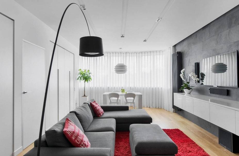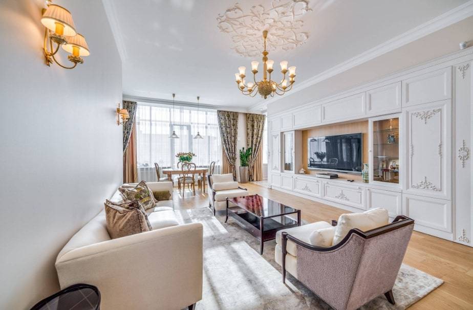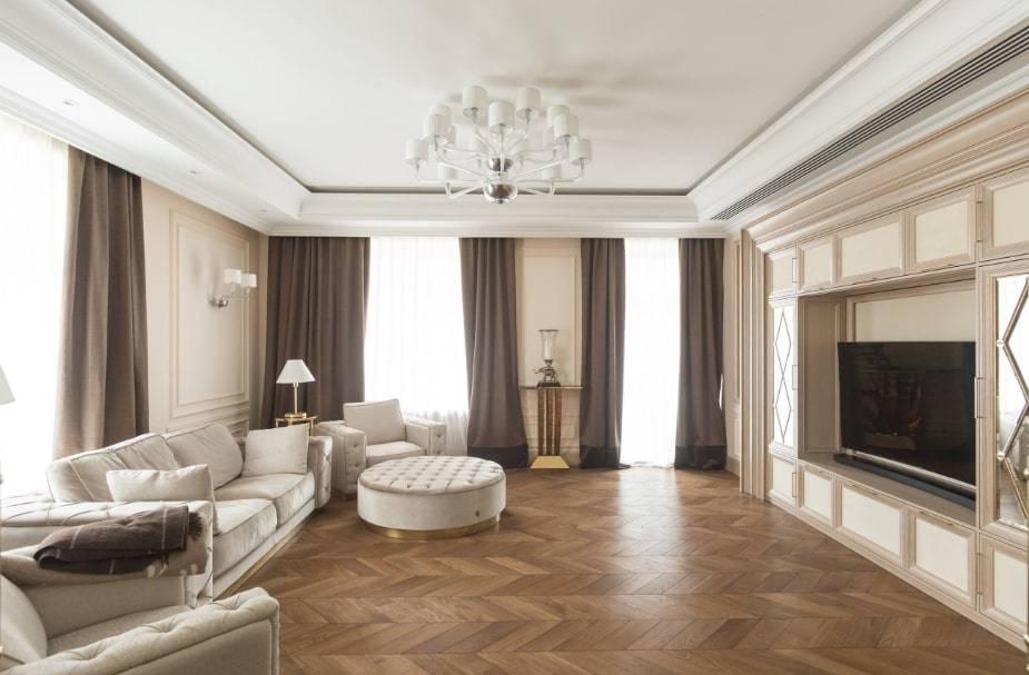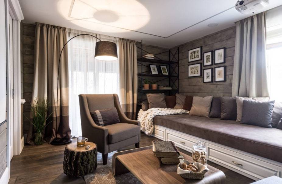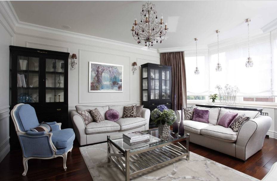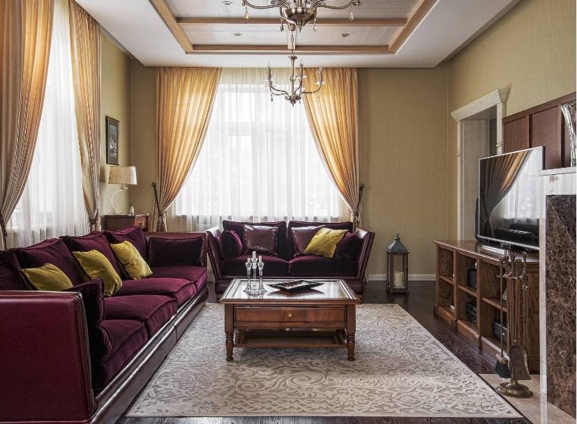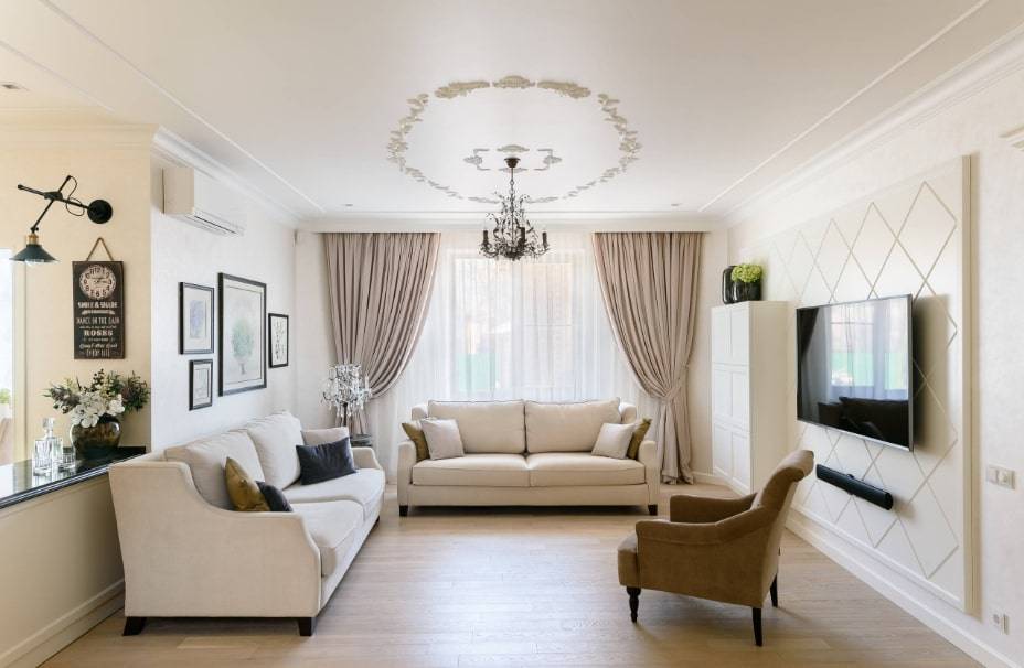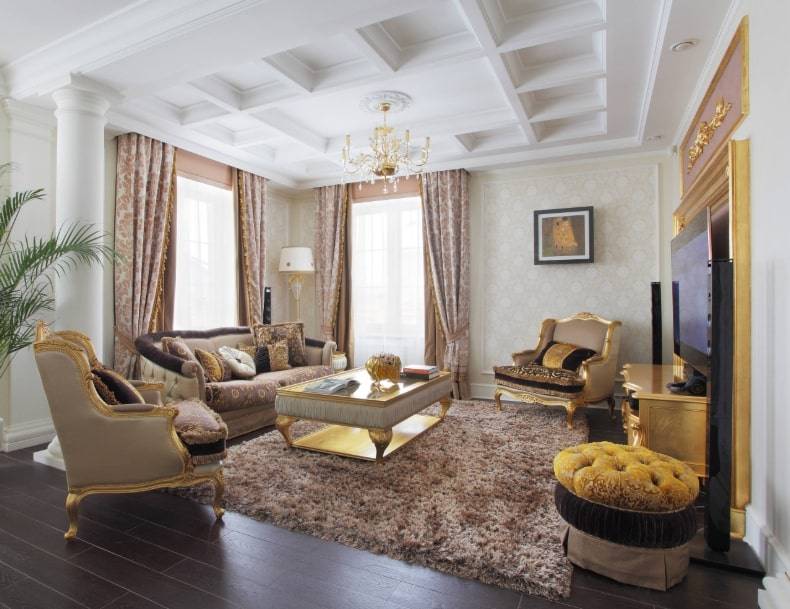 Для оформления потолка можно использовать натяжное полотно либо гипскартон с белоснежными потолочными плинтусами. Меблировать такую гостиную следует парой кресел и мягким диваном. Основная линия декора должна проявляться и в дизайне обивки мебели.
