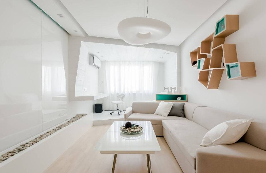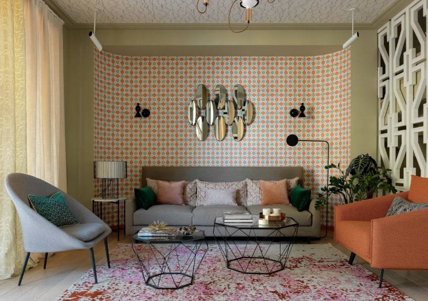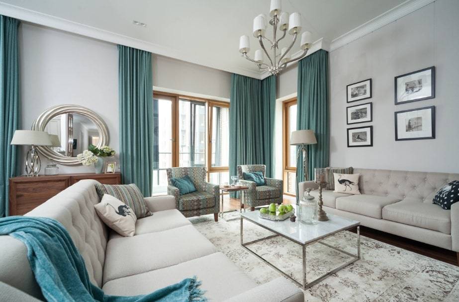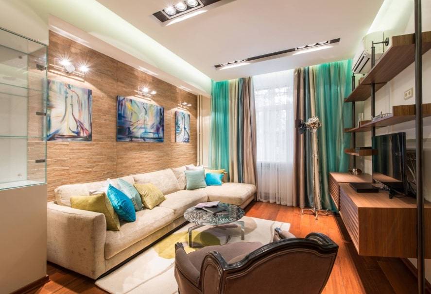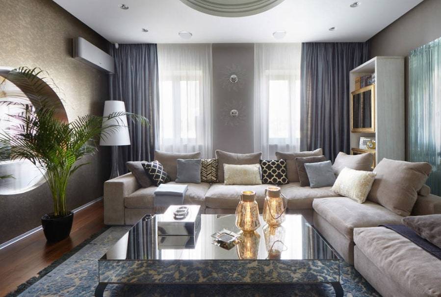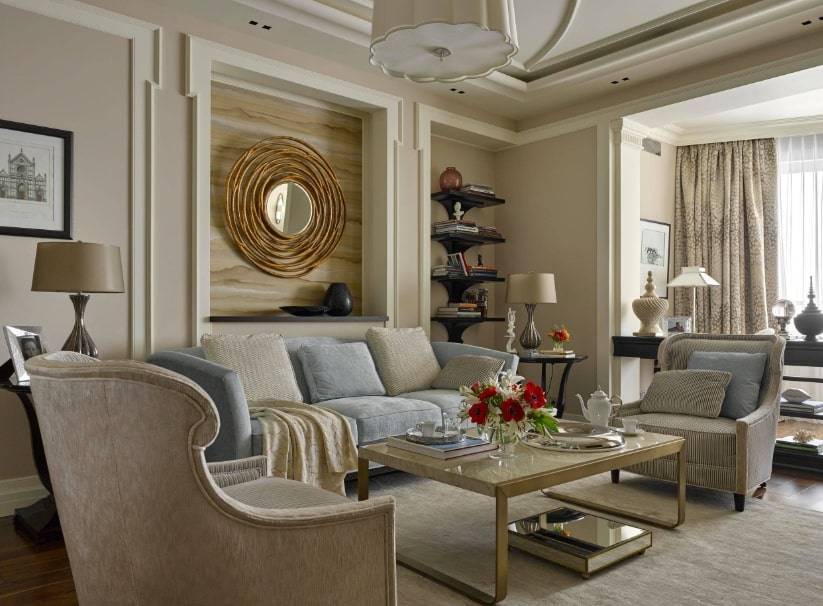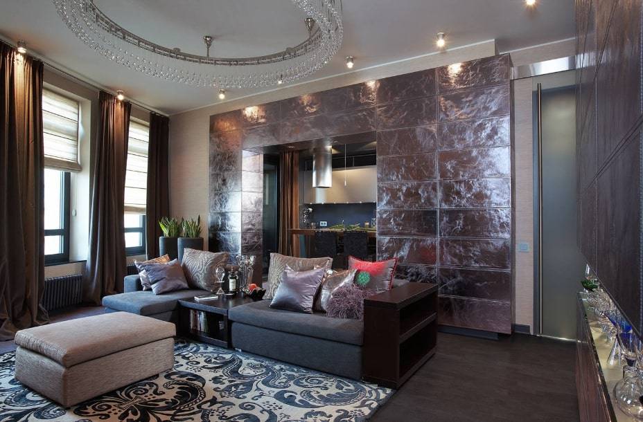 Оформление зеркалами уместно в прямоугольной и маленькой комнате. Это может быть панно, плитка или панели квадратной, или другой формы. Светлые тона и отражение окна или дверного проема добавят простора в гостиную, а отражение соседней стены или мебели наоборот уменьшит пространство.