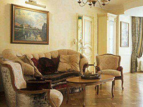 Дизайн зала в стиле «ретро» предусматривает романтизацию прошлого с созданием его безмятежного и радостного образа. Стены следует одеть в «обои» бежевого спектра. Пол желательно покрыть ламинатом, имитирующим светлые древесные доски. Обязателен напольный ковер, выполненный в коричневой гамме.