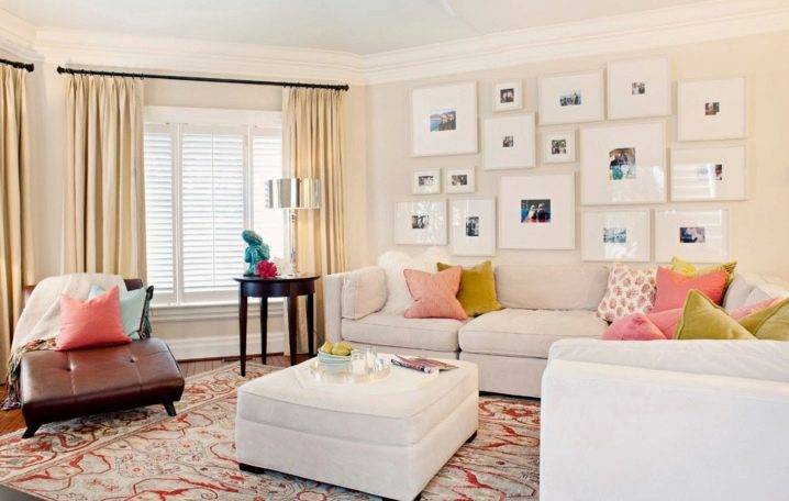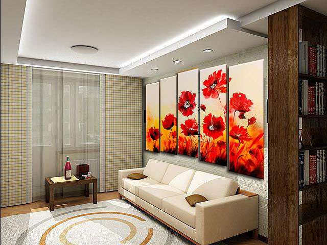 Зачастую, модульные картины, используемые в интерьере гостиной, оформляются на холстах. На такого рода холстах можно изобразить все, что угодно: от пейзажей до семейных фото.