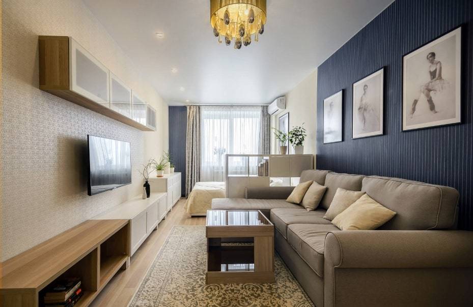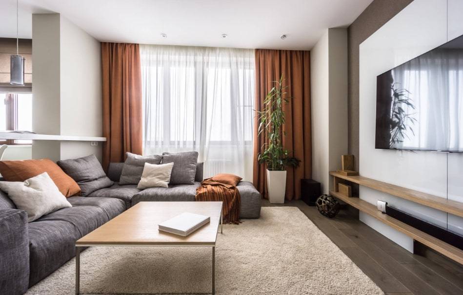 Телевизор можно повесить на стену, установив под ним деревянный комод светлых тонов с высокими ножками. По обе стороны от него можно поставить невысокие тумбы, имеющие по одному ящику. Центральную часть зала должен занять установленный на ковре журнальный столик.