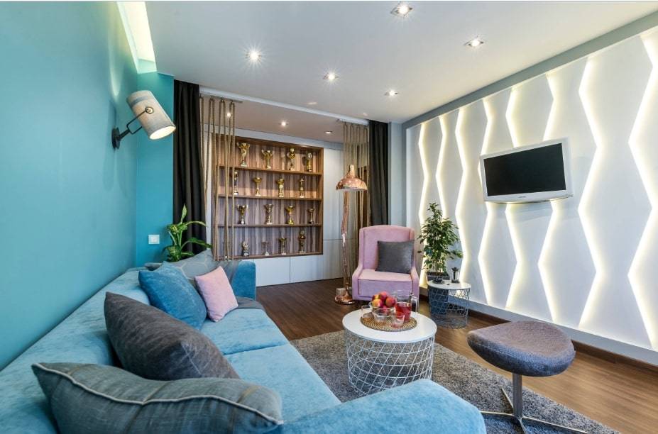 Стеновые 3д панели в оформлении гостиной с барельефом и горельефом подойдут для создания акцента даже в тон основных стен, легко крепятся и не требуют дополнительного выравнивания. Бывают деревянные, стеклянные, пластиковые, из МДФ, гипса.