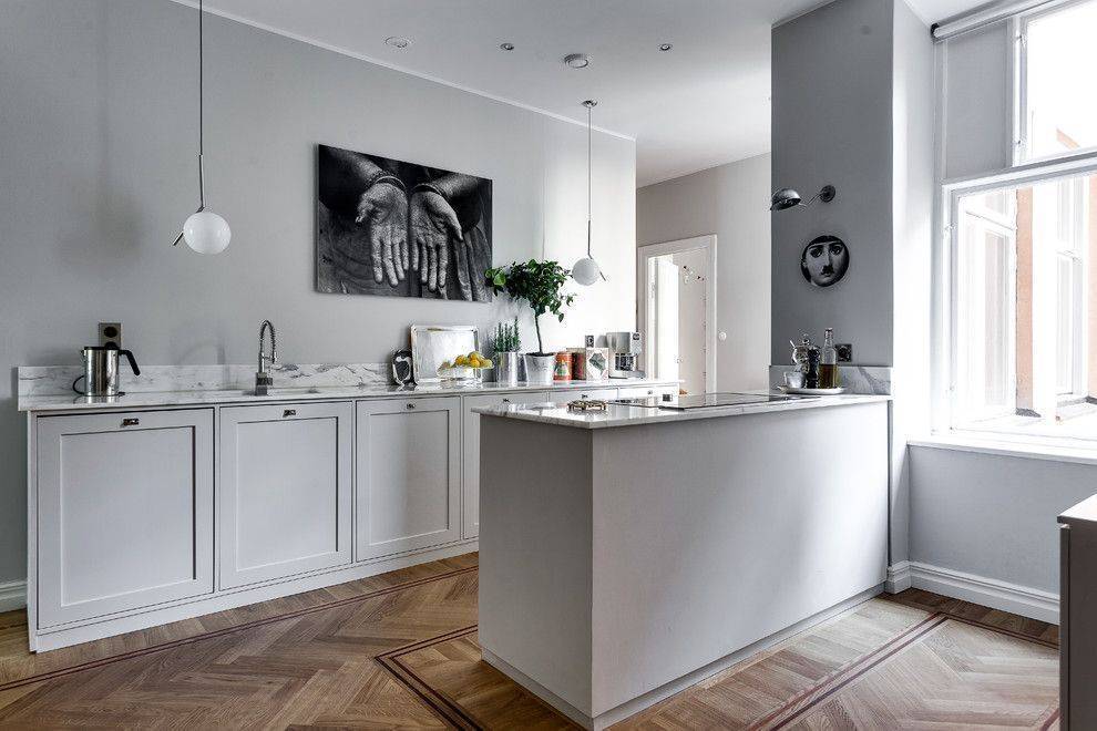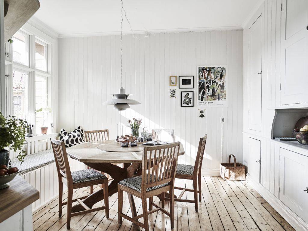Белоснежные стены скандинавского интерьера можно украсить с помощью плакатов, фотографий, интересных картин в узких рамках, оригинальных скульптур, авангардных арт-объектов, различных зеркальных и деревянных элементов или других изделий из натуральных материалов.