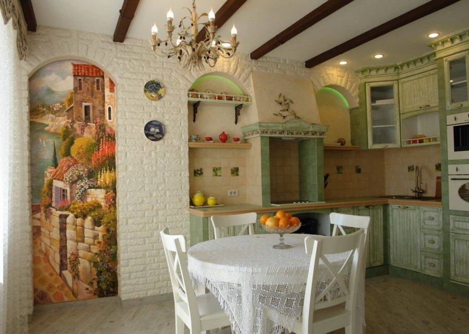 Прованс чуть отличается от кантри, так как в цветовой гамме прованса должны преобладать более нежные оттенки. Что касается фресок, то они должны быть небольшими по размеру. Изображать можно мотивы из европейской архитектуры или пейзажа.
