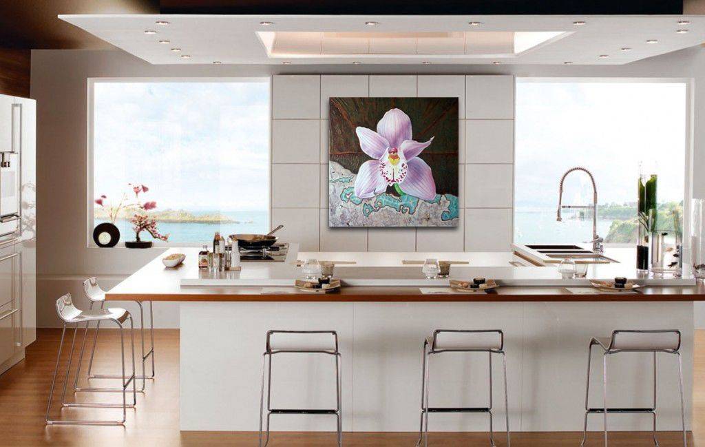 При выборе изображений с цветами нужно смотреть на весь стиль кухни. Орхидеи, являющиеся прекрасным дополнением к модерну, будут вычурно смотреться в помещении, выдержанном в стиле прованс. И в то же время полевые и луговые цветы, так хорошо смотрящиеся на стенах при классическом или деревенском стиле, потеряются на фоне современного кухонного гарнитура.