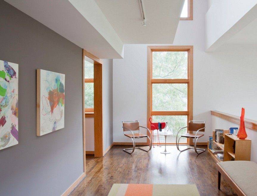 Параллельные стены зрительно сужают объем помещения, делая его более узким. Кроме того, в таком коридоре человек интуитивно проходит в самый его конец, минуя другие двери. Зрительно делают комфортным интерьер длинного коридора яркие контрастные двери и зонирование стен.