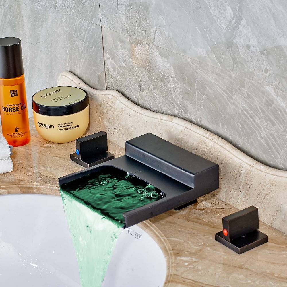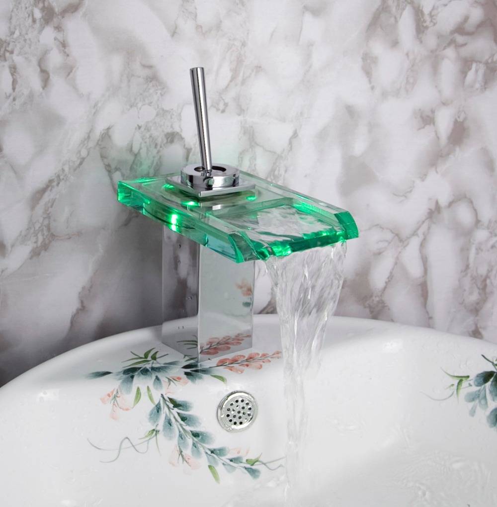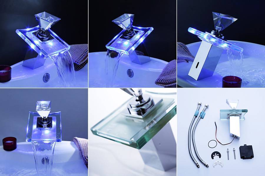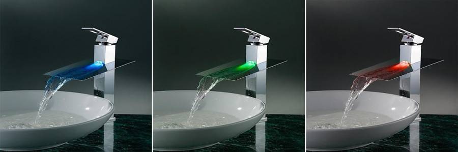 Очень удобны в ванной смесители со светодиодной подсветкой, особенно, когда излив и рычаг выполнены из стекла. В темное время работающий стеклянный смеситель водопад создает таинственную атмосферу. Светодиодная лампа меняет свои цвета с зеленого (0-30 °C) на синий (30-40 °C) и на красный (40-50 °C). При температуре свыше 50 °C, подсветка мигает. Встроенная лампа работает на батарейках, но в комплекте они не идут.
