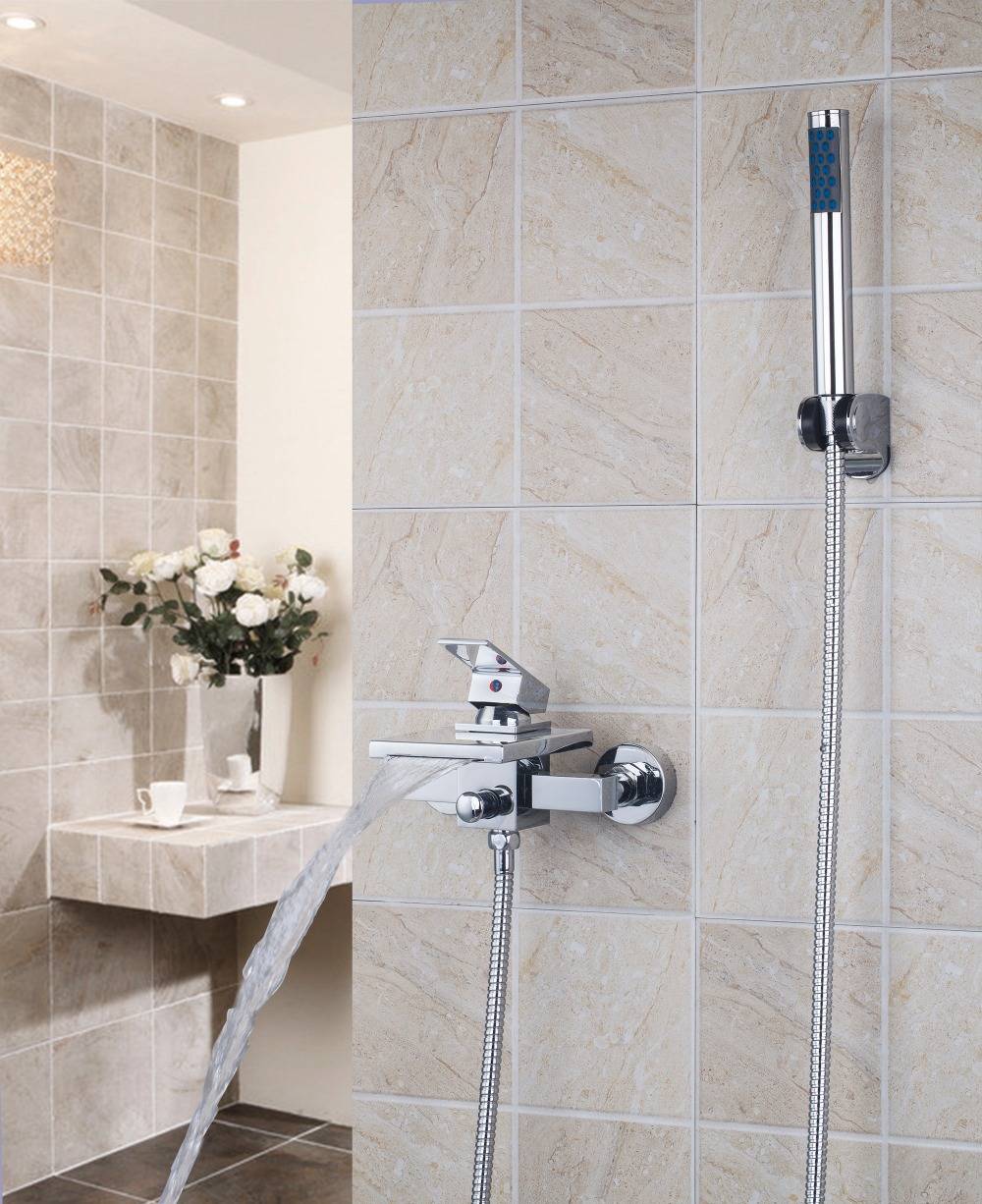 Каскадный кран на стене может располагаться вверху (на уровне головы) или внизу стены с возможностью контролировать высоту подачи воды. Последний вариант отличается тем, что внутри сложной конструкции имеется выдвижной шланг. Крепление водопадного смесителя вверху предусматривает наличие блока управления в любом ином месте комнаты, и может заменять лейку душа.