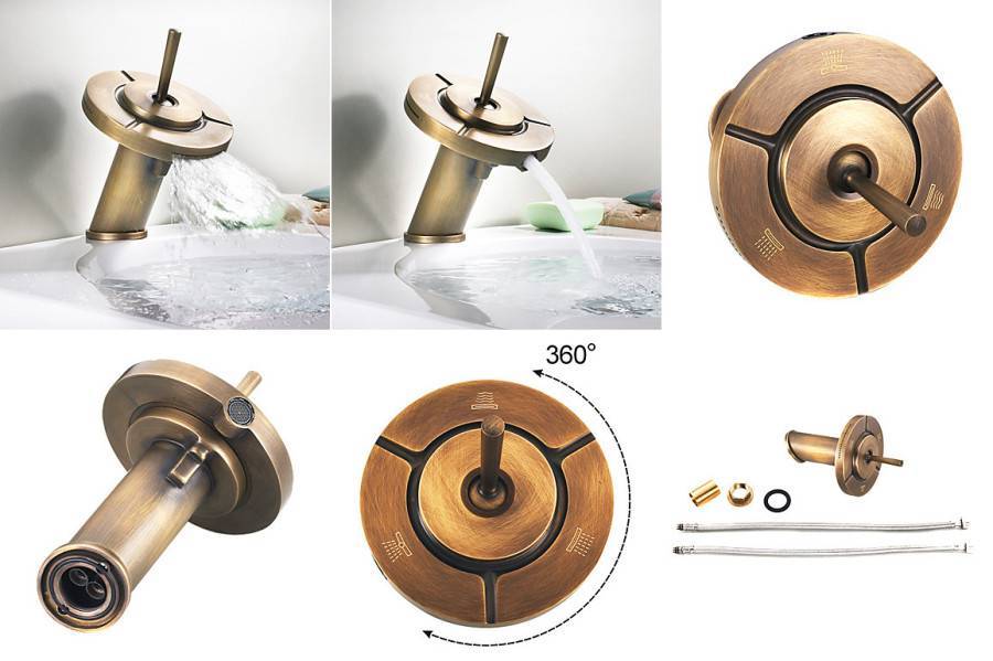 На сантехническом рынке можно встретить смесители с вращающимся изливом. В цвете антик круглой формы излив на ножке того же цвета уж точно удивит гостей.