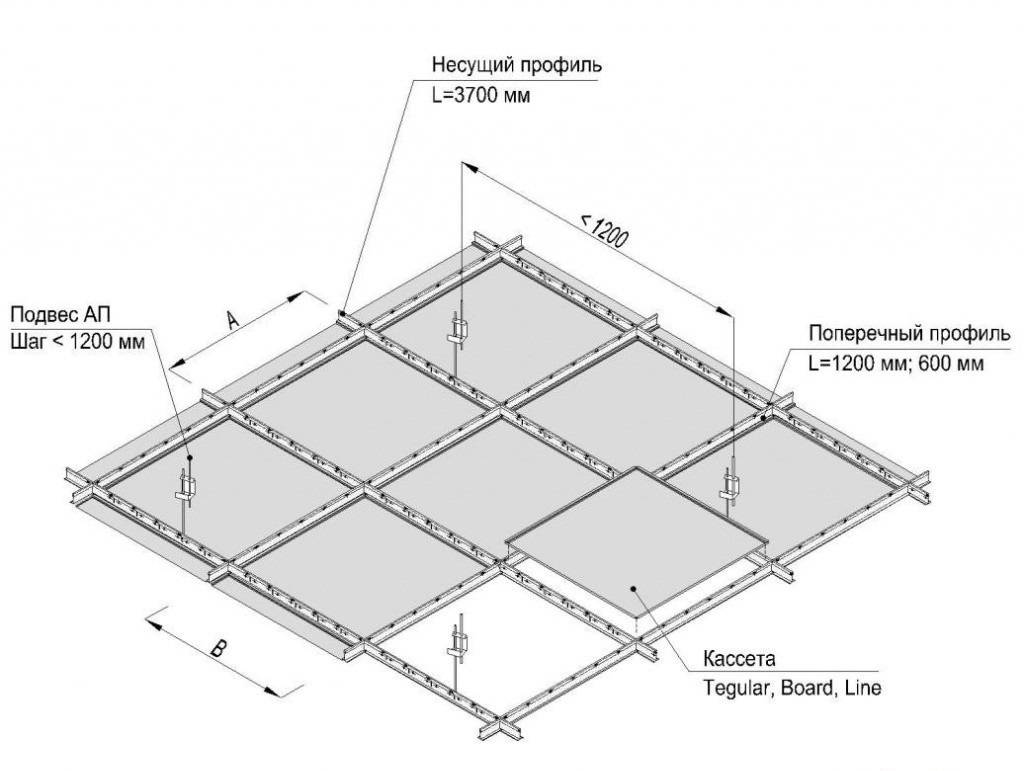 Покрытие кассетного типа широко применяется для отделки самых различных помещений. Кассетный потолок представляет собой подвесную конструкцию, состоящую из следующих элементов: