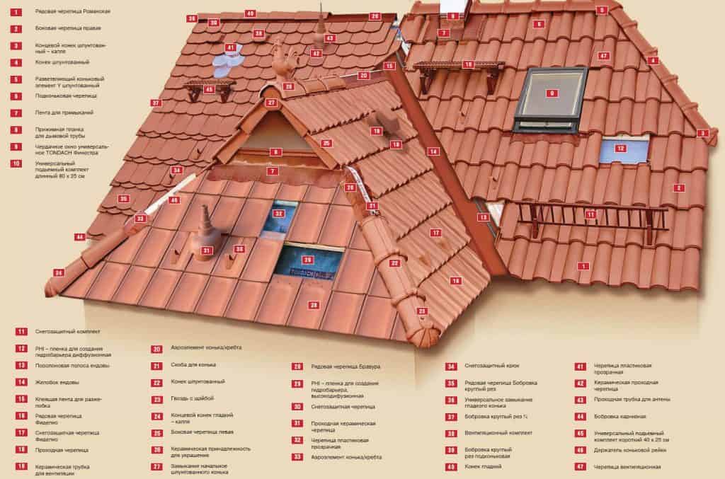 Кроме устройства воздушных прослоек для вентиляции кровли при укладке керамической черепицы используются специальные элементы: