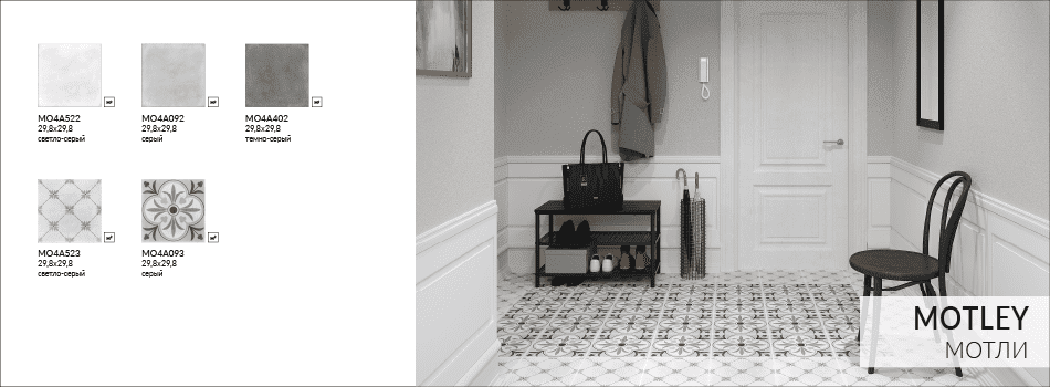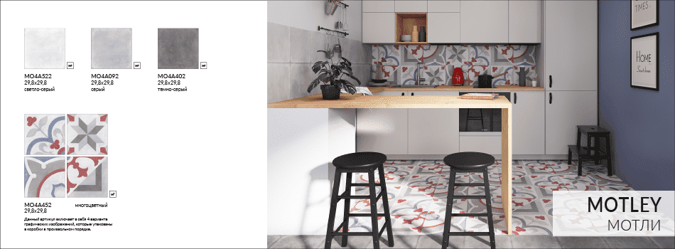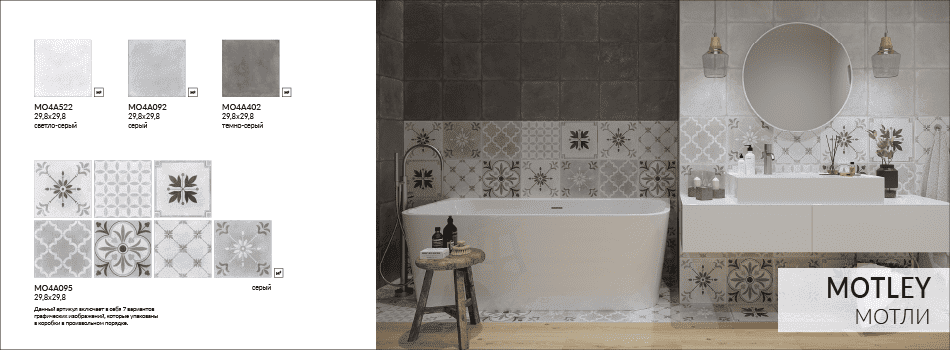 Монохромная плитка MOTLEY открывает большие возможности по созданию уникальных интерьерных решений. Семь геометрических и растительных рисунков могут выкладываться как самостоятельно в виде современного пэчворка, так и в сочетании с другими элементами коллекции. Комбинация однотонной и цветной узорной плитки позволит элегантно зонировать пространство.