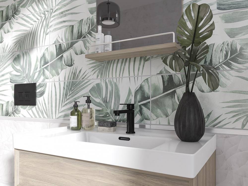 Таким свойством обладает рисунок с листьями монстеры коллекции Cariota Интересная композиция получается из декоративных элементов флористической коллекции Omnia, «мраморной» плитки Versal и переосмысленного современностью пэчворка Manhattan, который можно усилить акцентным красным бордюром. Стыкующиеся во все стороны декоры часто выполняют очень важные функции: так, Omnia способна взять на себя смысловую нагрузку в помещениях в стиле ар-деко, а Manhattan — искусно воссоздать скандинавскую сказку.