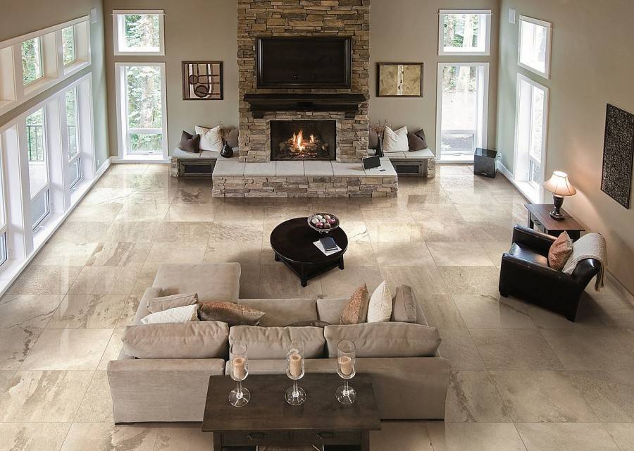 В большой гостиной кухонную зону можно выложить такой плиткой, а обеденную зону и зону для отдыха с диваном можно оформить натуральным деревом или даже ковролином.