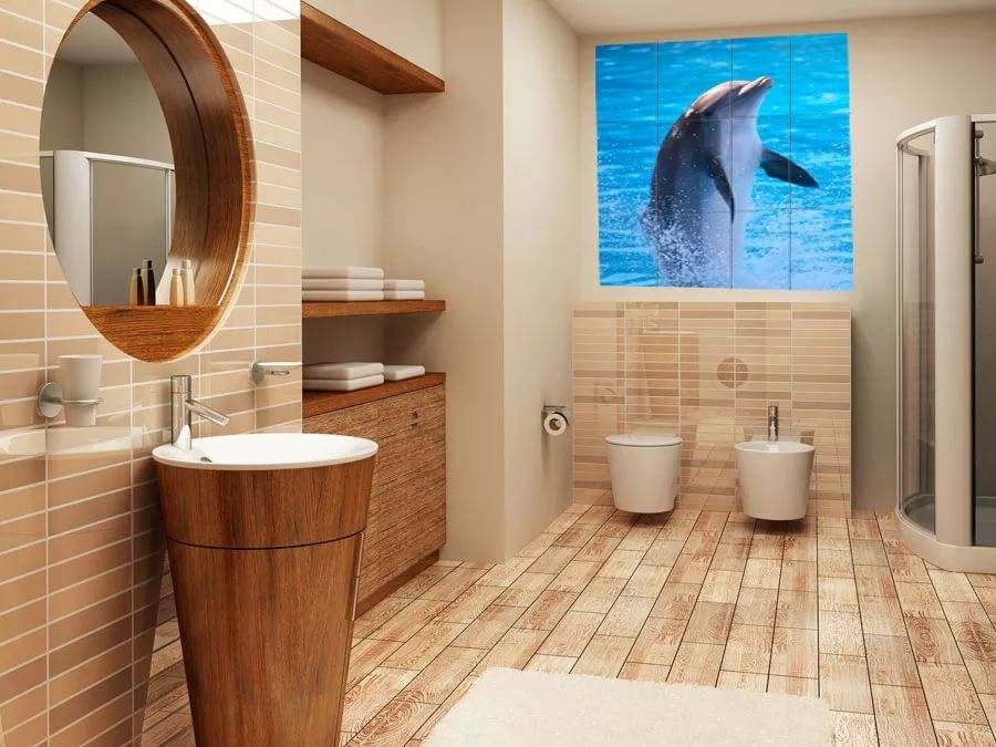 Многие дизайнеры домашних интерьеров обращаются к имитации древесины в оформлении комнат с повышенной влажностью. Например, для ванной это идеальный вариант, поскольку натуральное дерево не терпит сырости и влаги, а кафельная плитка ее совсем не боится.
