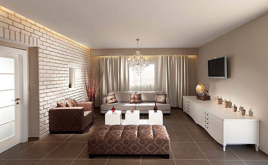 Наличие стены из кирпичей в гостиной – это проявление индивидуальности и элегантности в противовес уже надоевшим интерьерам с преобладанием отделки из стекла и камня.