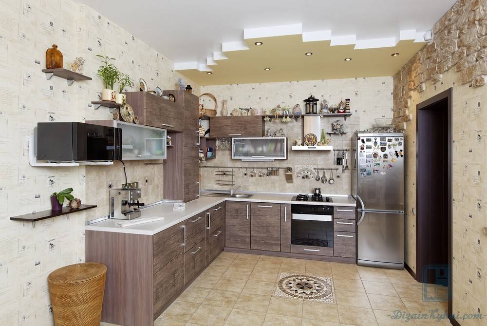 Потолочные балки скрывать не обязательно. Их можно выделить, покрасив в яркий цвет или просто покрыв лаком. Дополнит картину интересная лампа по центру из натуральных материалов. Закрытую кухню обязательно оснащают вытяжкой.